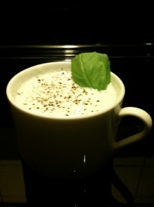 Répartir dans 4 tasses ou verres, décorer avec une feuille de menthe ou de basilic.