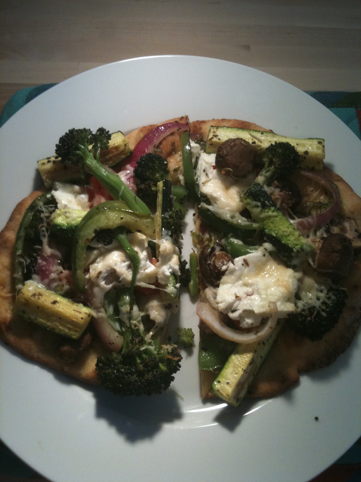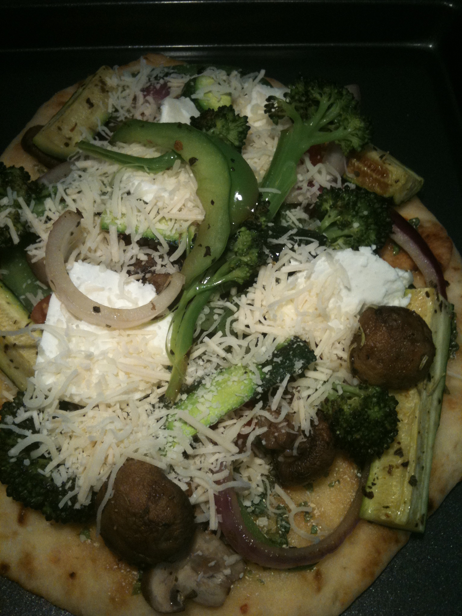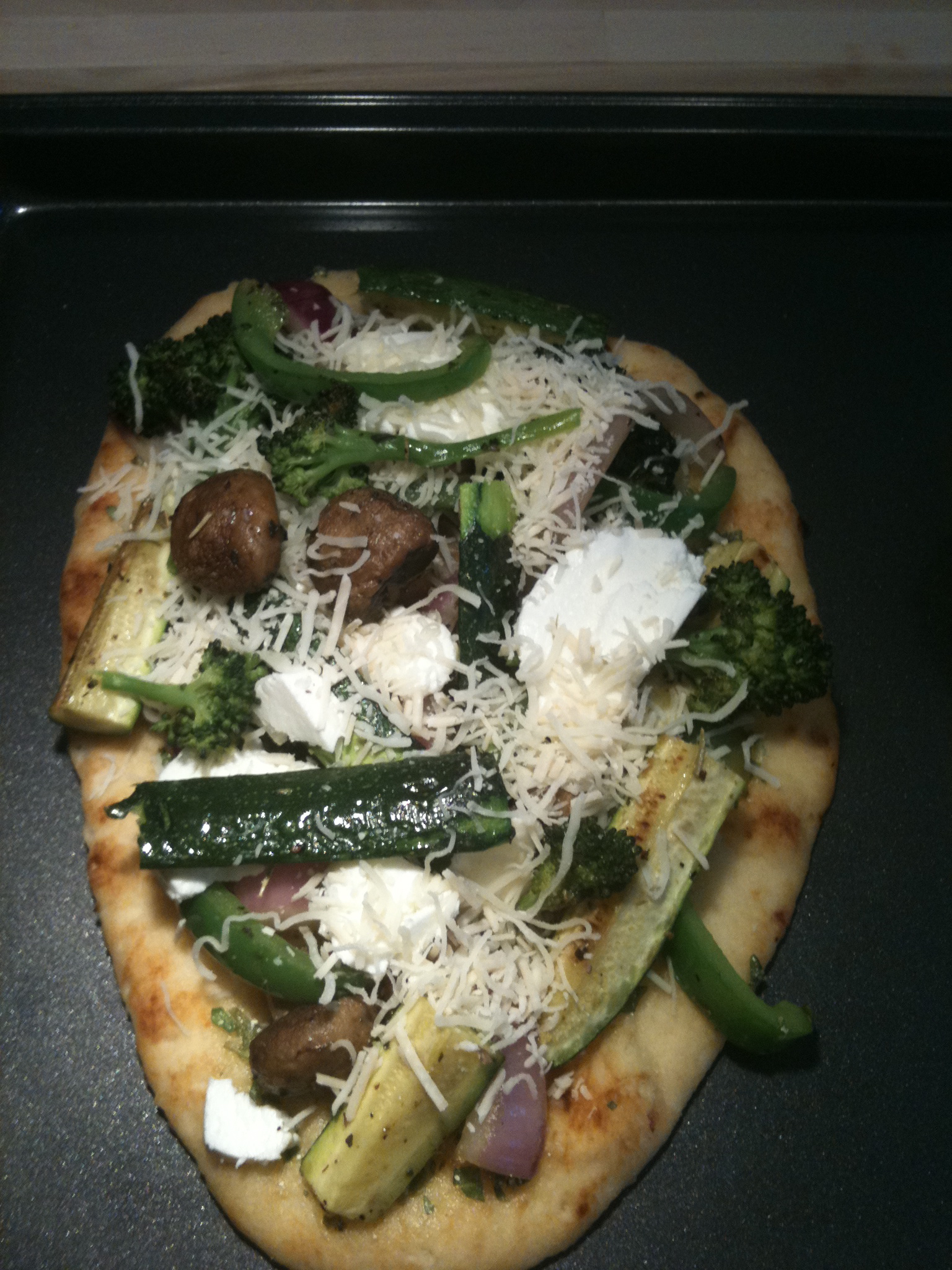 Étendre un peu de pesto de basilic à la cuillère sur le pain naan. Par la suite, vous devez y disposer vos légumes. Ajouter le fromage de chèvre ainsi que le fromage râpé. Ajouter, comme il vous plaira, viandes, saucisses, herbes, etc. –