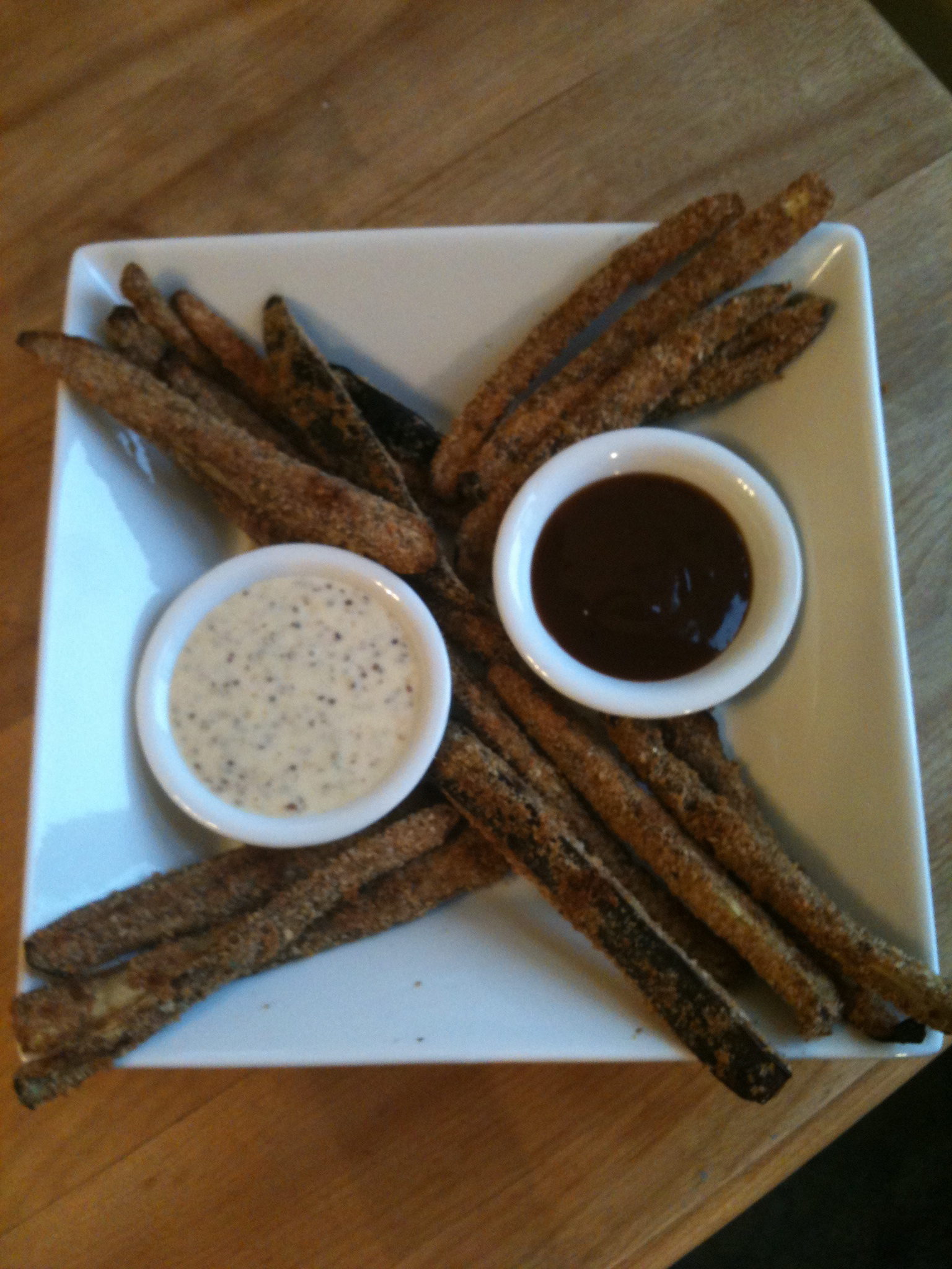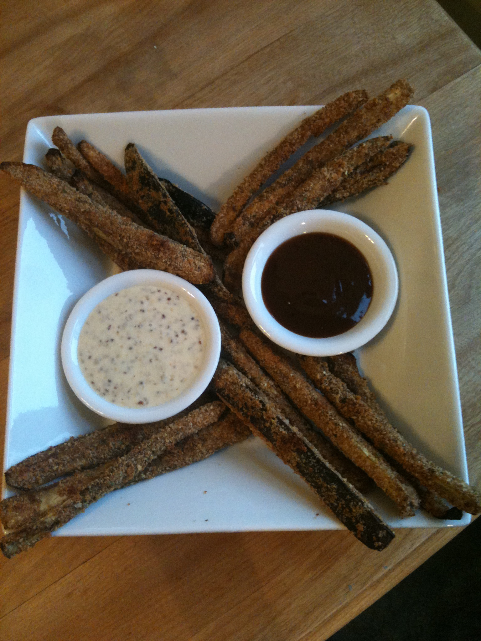 Couper l’aubergine en julienne. Faire dégorger avec du sel quelques minutes. Passer les juliennes dans un oeuf battu. Mélanger de la chapelure avec du parmesan râpé et vos épices préférées. Ne pas ajouter de sel si vous utilisez de la chapelure du marché. Mettre votre chapelure dans un sac (un grand ziplock fera l’affaire) et ajouter les juliennes pour bien faire coller la chapelure. Faire griller au four à 350 jusqu’à ce que la chair soit tendre et l’extérieur croquant (environ 15-20 minutes). Il est également possible de faire revenir les aubergines dans une poêle avec de l’huile. Déguster avec une sauce ou une mayonnaise maison. –