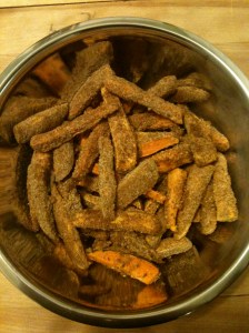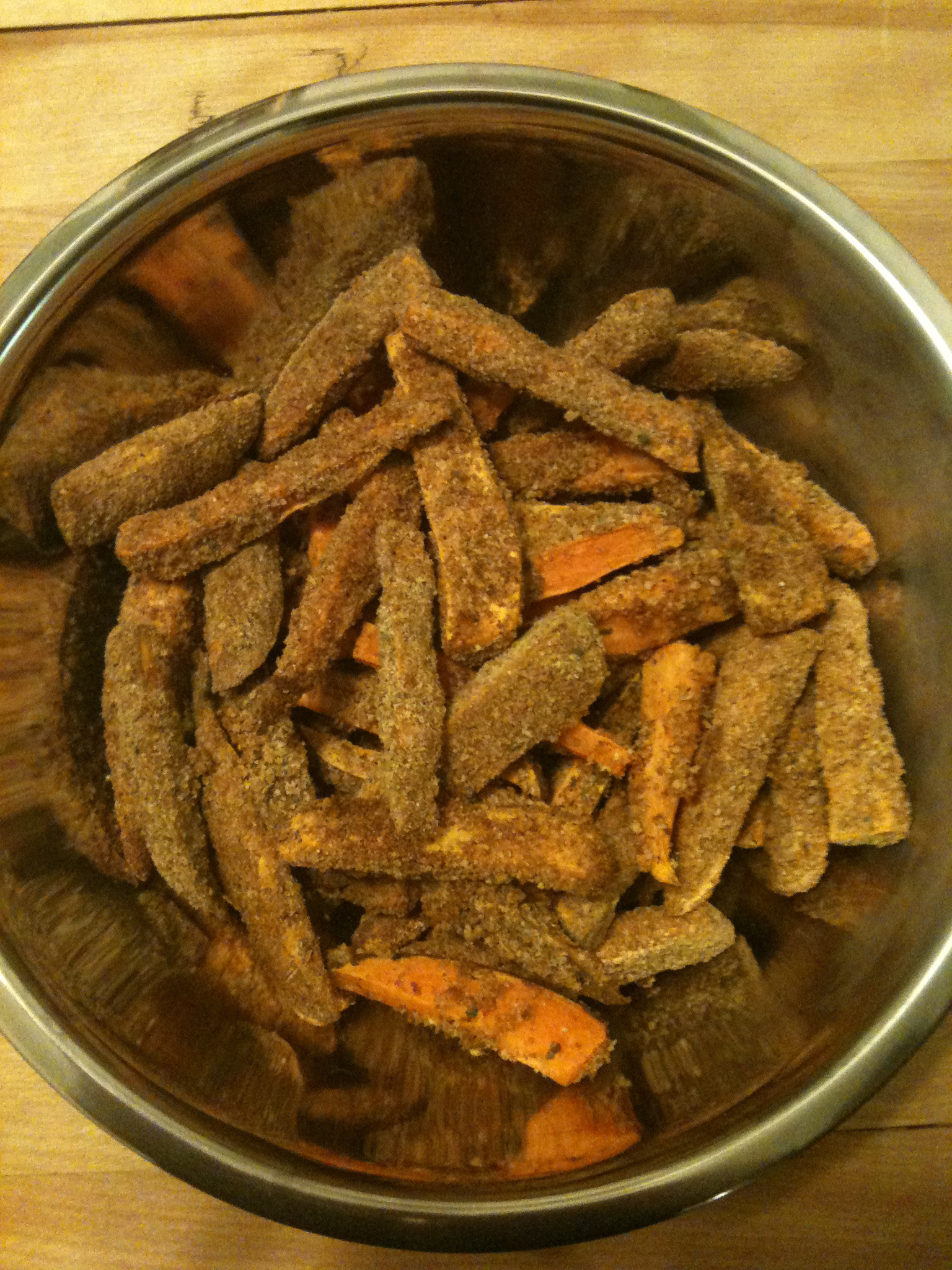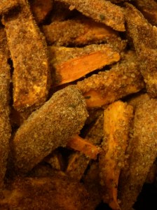 Couper vos patates en juliennes.  Passer les juliennes dans un oeuf battu.  Mélanger de la chapelure avec vos épices préférées.  Ne pas ajouter de sel si vous utilisez de la chapelure du marché.  Mettre votre chapelure dans un sac (un grand ziplock fera l’affaire) et ajouter les juliennes pour bien faire coller la chapelure.  Faire griller au four (environ 30 minutes) jusqu’à ce que la chair soit tendre et l’extérieur croquant.  Déguster avec une sauce ou une mayonnaise maison.