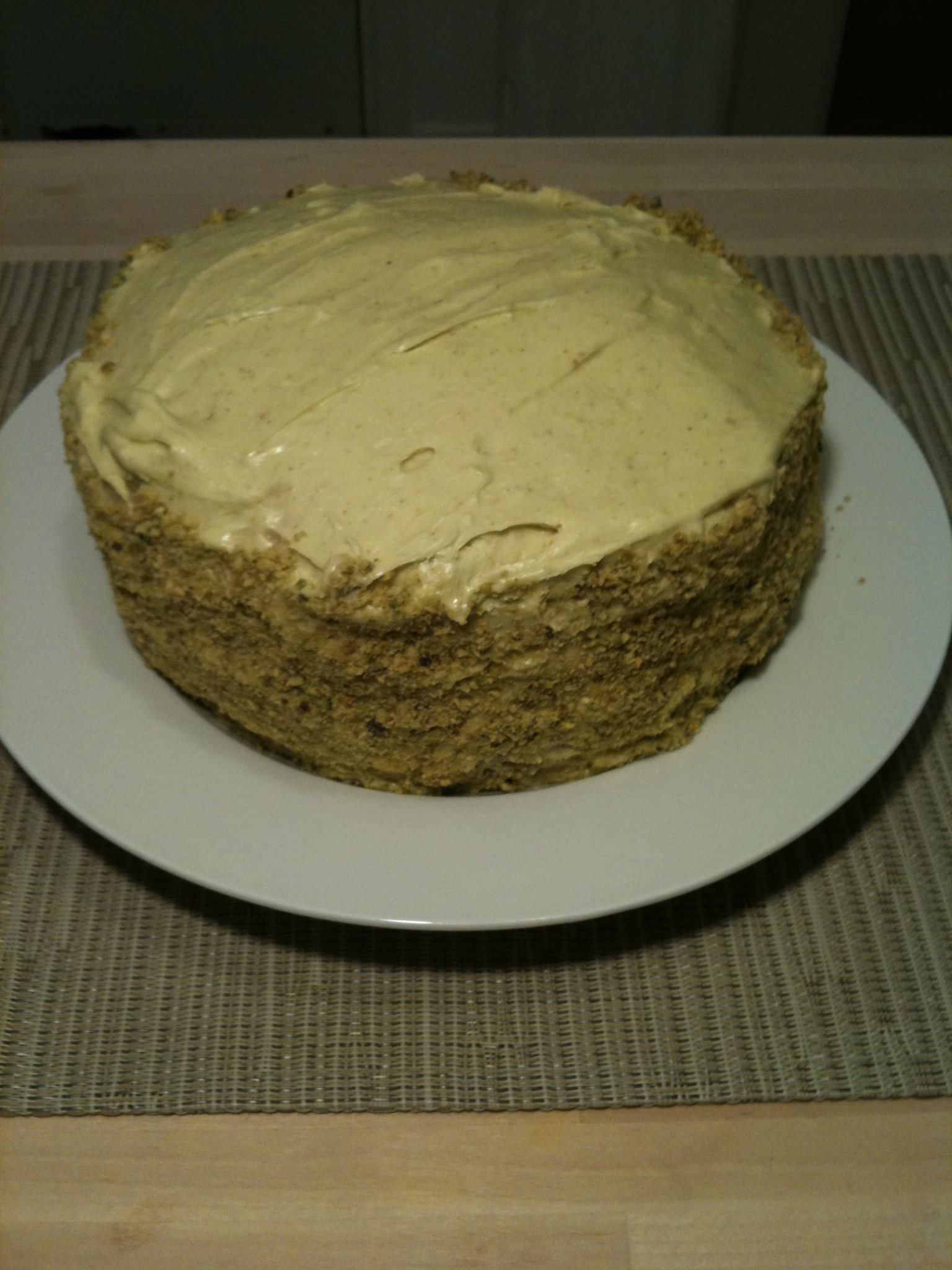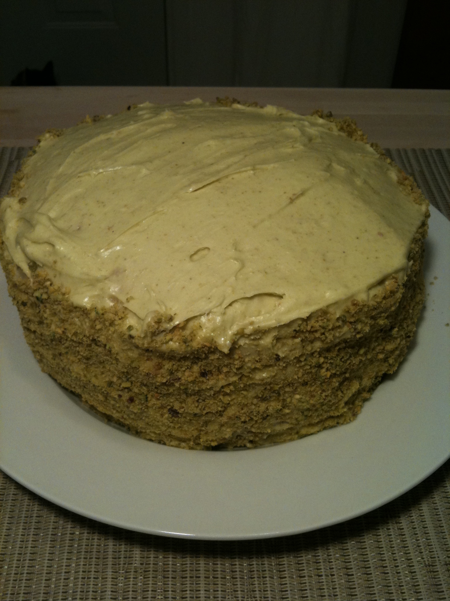 1. Sur un plan de travail, couper la calotte des gâteaux pour les égaliser. Garnir le dessus d’un gâteau avec le tiers de la crème au beurre. Parsemer avec les pistaches pralinées entières. Couvrir de l’autre gâteau et le glacer entièrement avec le reste de la crème au beurre. Presser les pistaches hachées tout autour du gâteau. Conserver dans un endroit frais mais pas au réfrigérateur.
