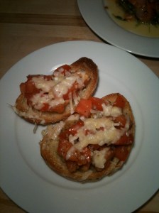 Mélanger tous les ingrédients sauf le pain. Mettre celui-ci au four pour le faire griller quelques minutes afin que la mie ne soit pas trop molle. Par la suite, ajouter le mélange sur le pain, mettre le fromage et gratiner au four pendant quelques minutes. Servir immédiatement. –