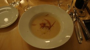 La serveuse commença par nous expliquer le menu d’une manière très attentionnée. J’aime quand les serveurs connaissent le menu et peuvent nous le détailler car cela facilite grandement notre choix. Quoique dans ce cas-ci, le choix était difficile. On commence donc par la soupe qui était délicieuse. Un potage panais et fenouil qui, sans être trop prononcé, nous ouvrait l’appétit pour le reste du repas.