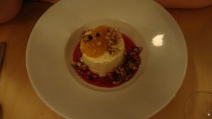 Un des convives avec qui j’étais a choisi le nougat glacé. Un dessert sublime, frais et subtile, il est servi avec un sirop d’hibiscus, une confiture de pêche blanche et un granola maison.