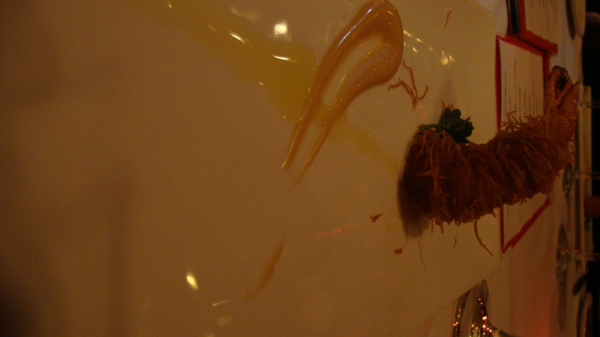 Nous avons continué avec un gambero kataifi con maionese di soya, une crevette enrobée de pâte frite servie avec une mayonnaise de soya. Un délice pour les yeux ainsi que pour l’estomac.