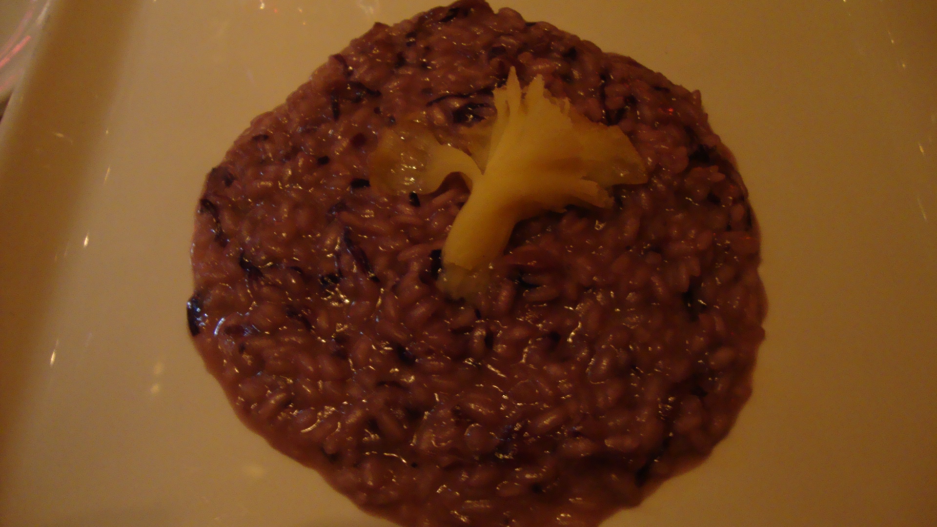 Le souper se continua avec le risotta al radicchio rosso con tête de moine. Ce fût malheureusement le plat que j’ai le moins apprécié. Ceci dit, le mélange de risotto avec le fromage tête de moine était sublime, mais sans le fromage, le goût du risotto était bien, sans plus.