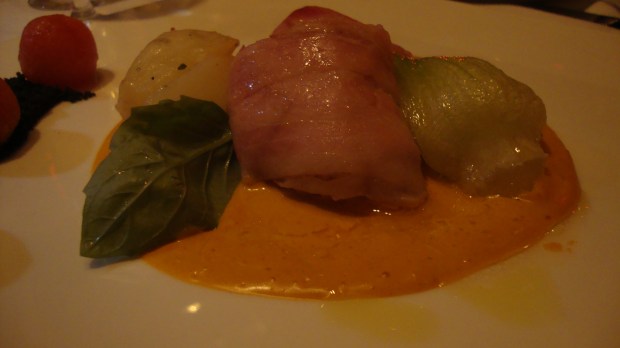 Retournons à la bouffe: nos hôtes nous ont ravis avec le prochain plat, merluzzo nero con e patate al vapore e crema di pomodoro. Un plat tout en douceur, qui se laisse déguster facilement.