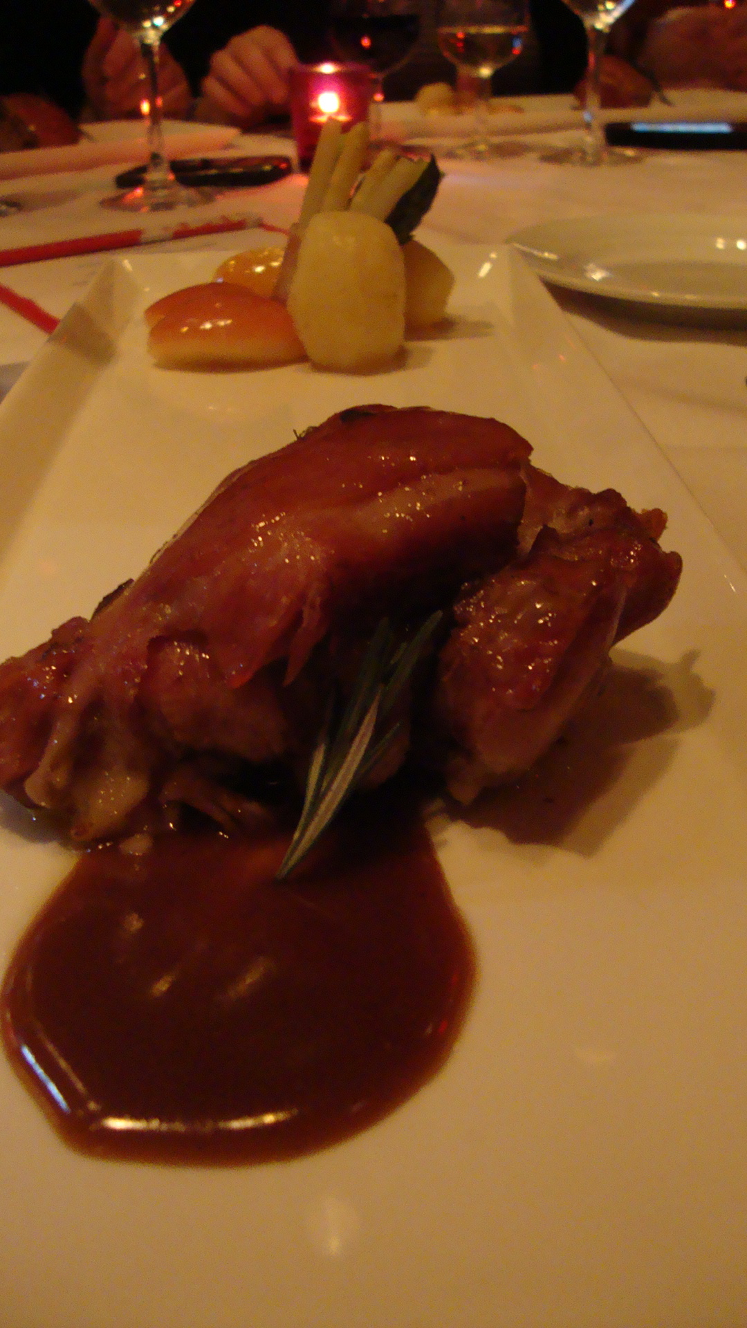 Le souper continuait. J’ai eu de très belles discussions avec les autres blogueurs présents, une soirée comme je les aime. Le prochain plat fût le maialino da latte con asparagi e mele. Le plat final, un morceau de porc extrêmement tendre servi avec des asperges et des pommes caramélisées. Je n’en pouvais plus de manger, mais ce plat était tellement bon. Les pommes caramélisées qui étaient mélangées avec le porc, complètement décadent.