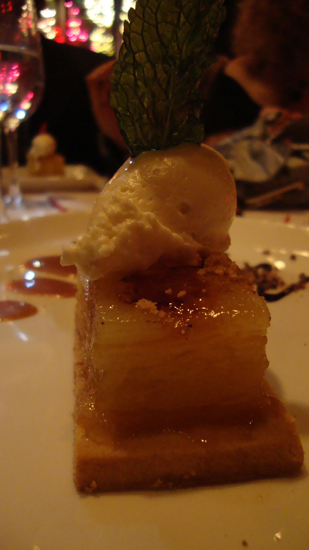 Pour le dessert, un Mille-feuille aux pommes et caramel. Surprenant et léger, ce dessert concluait bien notre repas gastronomique. Servi avec un Franciacorta Cuvée Brute, Bella Vista de Lombarie, c’était l’accord parfait.