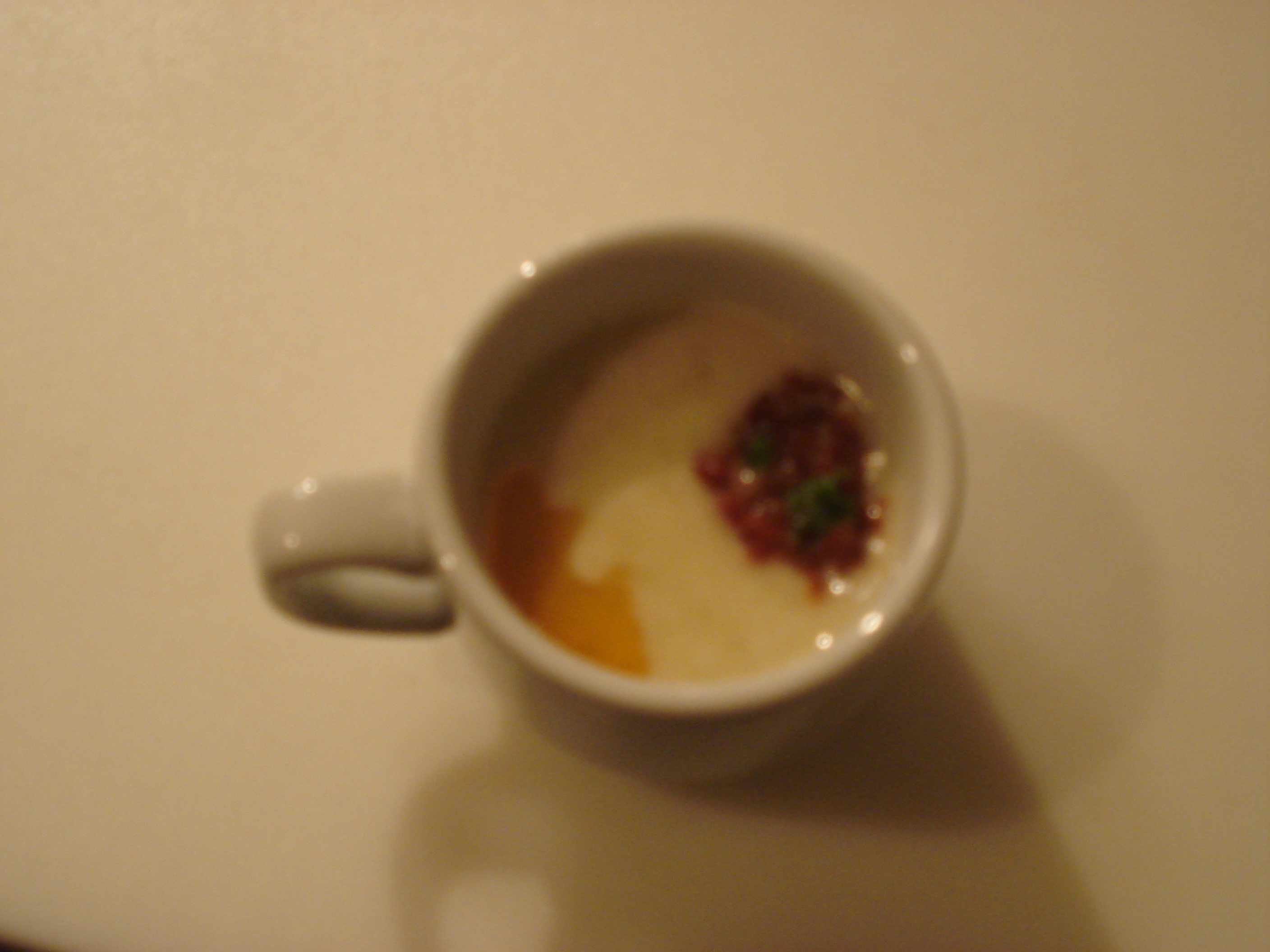 C’est là la façon habituelle de procéder à La Guilde Culinaire : les chefs procèdent à une démonstration, suivie de la réalisation par nous-même. Cet exercice a été fort sympathique puisque que je me trouvais avec des gens très intéressants. Il faut dire que le vin était très bon, ce qui aide les échanges! Voici donc l’entrée que l’on nous a servie, une salade de fenouil et mandarine. Je l’ai trouvée délicieuse, présentée sur des petites cuillères qui sont très tendance en ce moment (trouvez-les chez Dollorama pour vraiment pas cher).