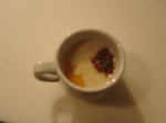 Il fallait simplement mélanger les ingrédients ensemble pour, par la suite, monter la verrine. Un peu du mélange de tarte au fond du verre, une couche de ricotta parfumée au curry, une autre couche de tartare, de la décoration culinaire, des arachides, du poivre rose et le tout était complet. Voici le résultat :