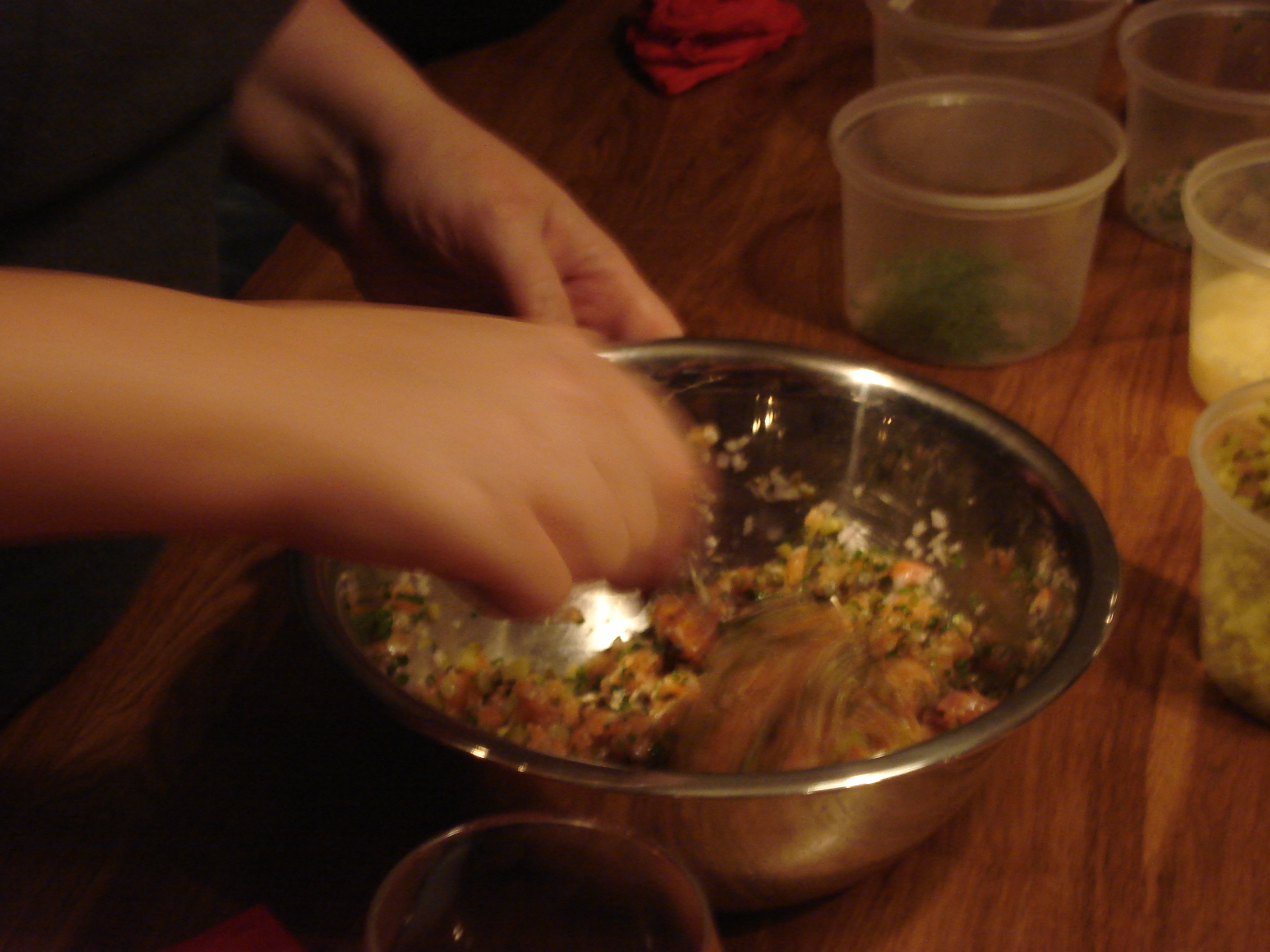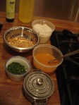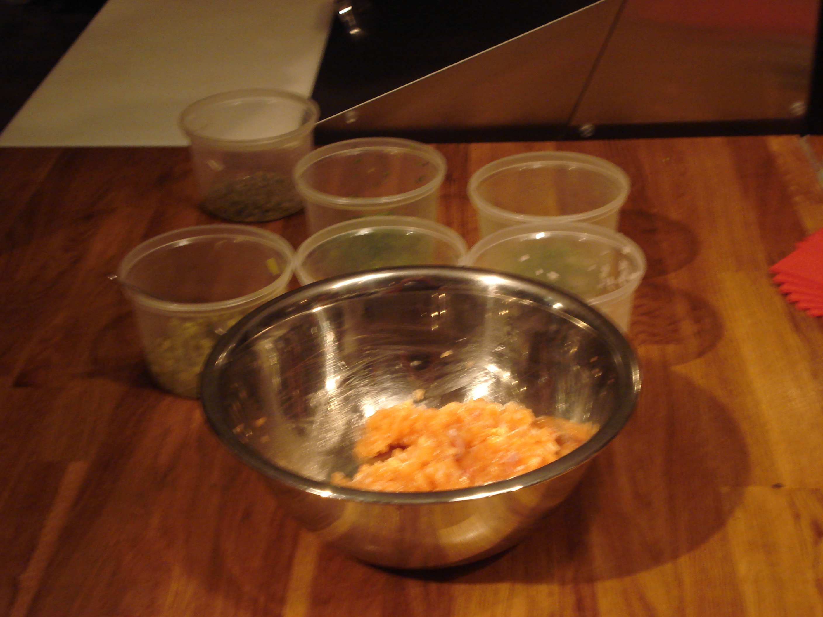 À notre tour maintenant, nous devions réaliser une verrine avec les ingrédients suivants : saumon, ricotta parfumé au curry, sel, poivre rose, menthe, huile, mangue, etc. J’ai rencontré Gabrielle Chalifoux du blogue Prétextes qui m’a aidé dans la préparation.