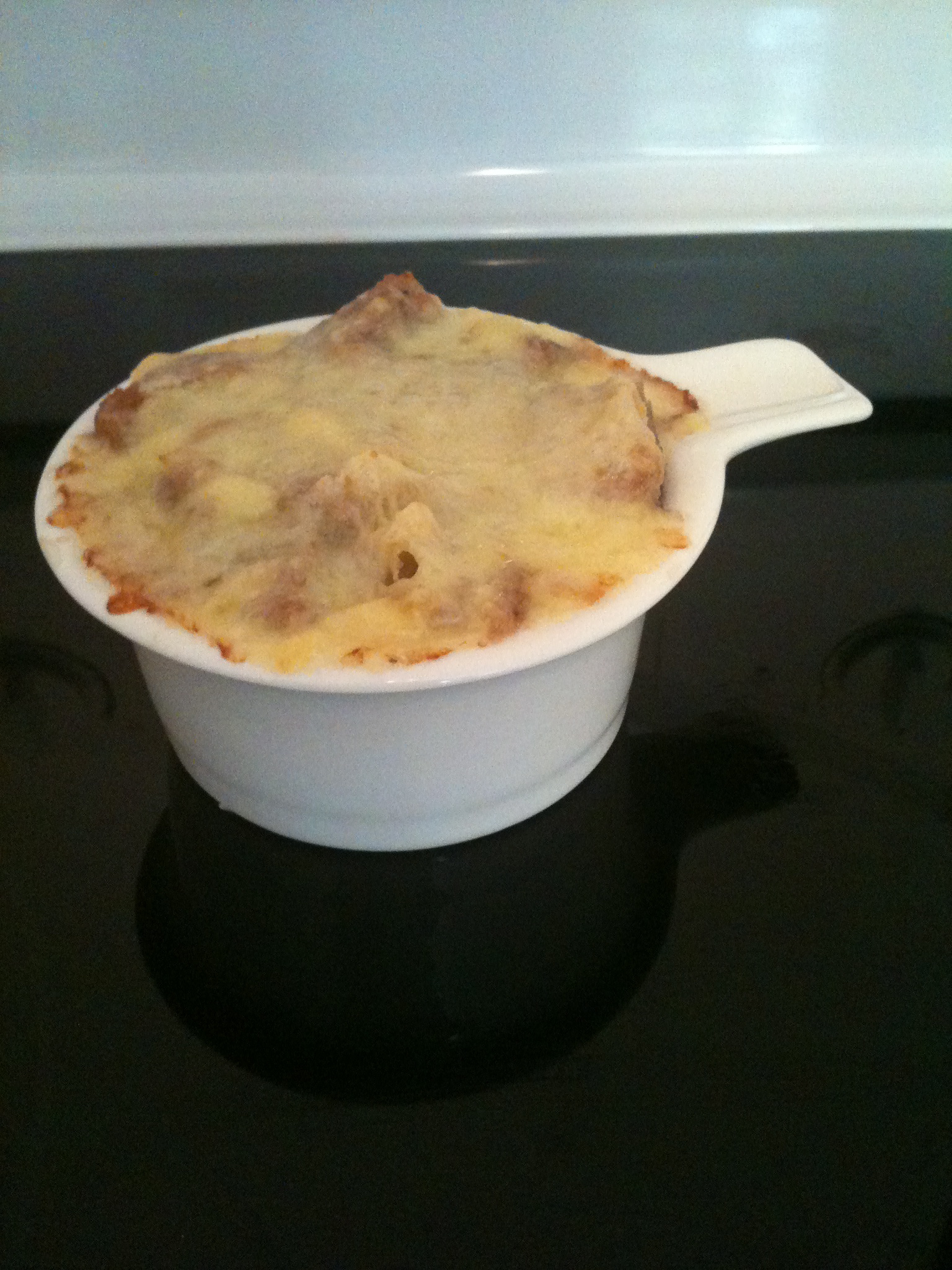 Me voilà chez moi un dimanche soir et, malgré la chaleur, j’avais le goût de manger de la soupe à l’oignon. N’ayant ni vin, ni bière sous la main, je ne savais pas trop quoi faire. Une bouteille de mousseux que j’avais acheté quelques semaines plus tôt me saute alors aux yeux. Pourquoi ne pas essayer, me dis-je ! Le résultat était aussi fameux que les deux coupes de mousseux que j’ai pu boire à ma santé! 😉