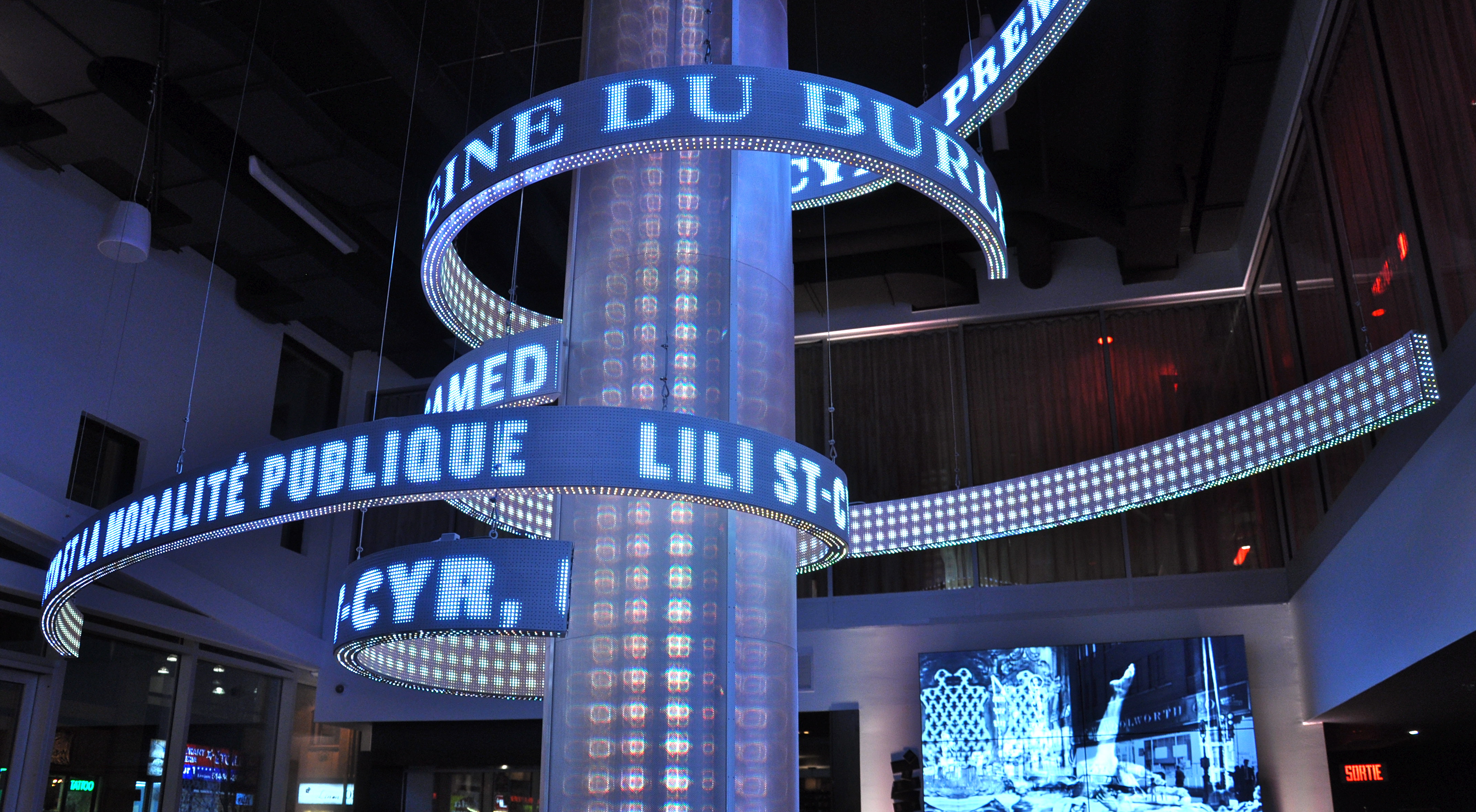 Le Nüvü est un nouveau bistro situé au 1336 rue Sainte-Catherine Est. On nous y promet une Expérience. Des écrans ACL, des projecteurs multimédias et des toiles de l’artiste Dominic Besner décorent le bistro. Un décor parfaitement orchestré tout en blanc avec un éclairage changeant selon les projections. Les serveurs habillés de noir font un beau contraste avec le décor.