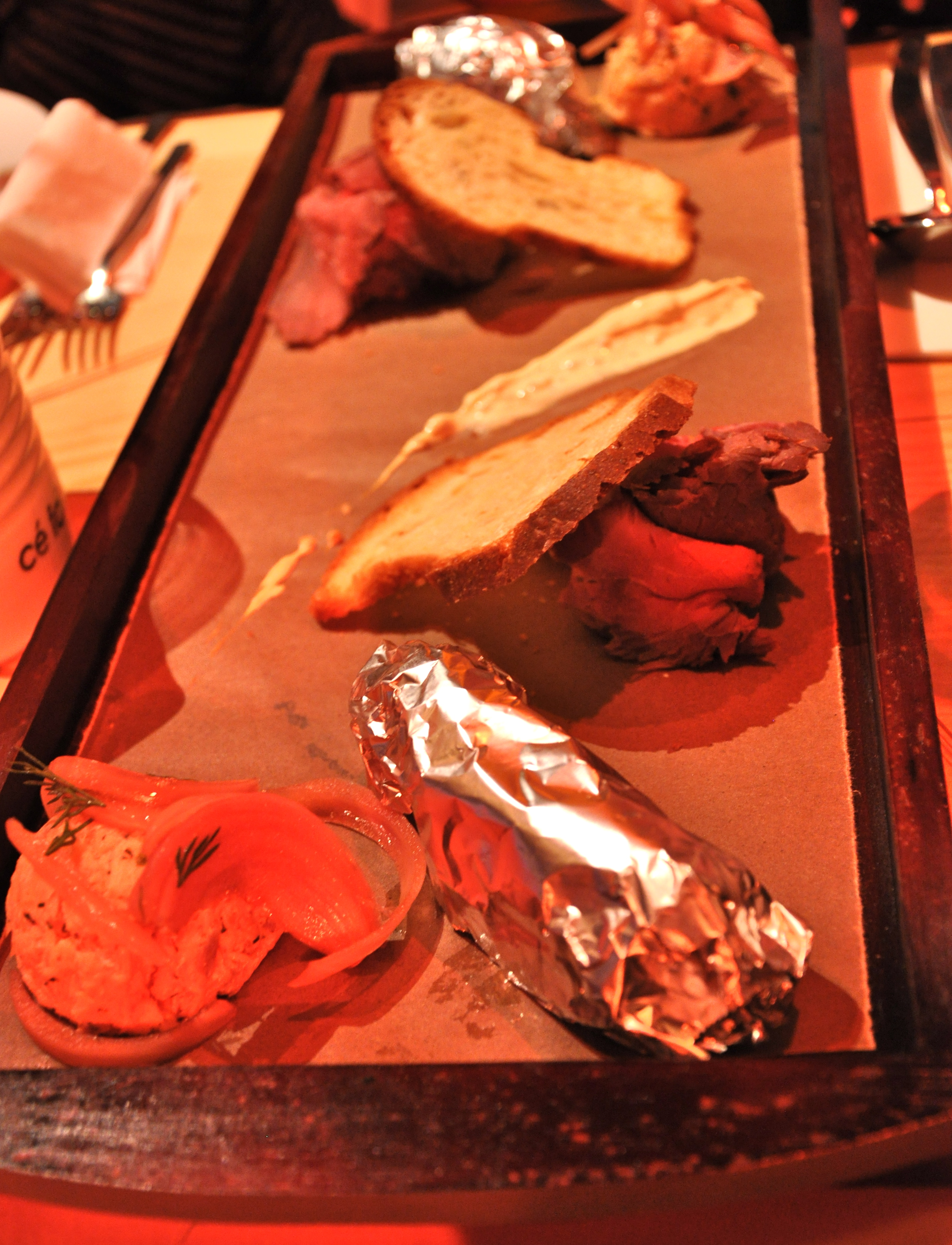 Bison fumé façon "smoked meat" avec toast melba maison, Cretons de truite et marinade d'oignons, et finalement (dans la feuille d’aluminium), Petit pain farci de "pulled pork".