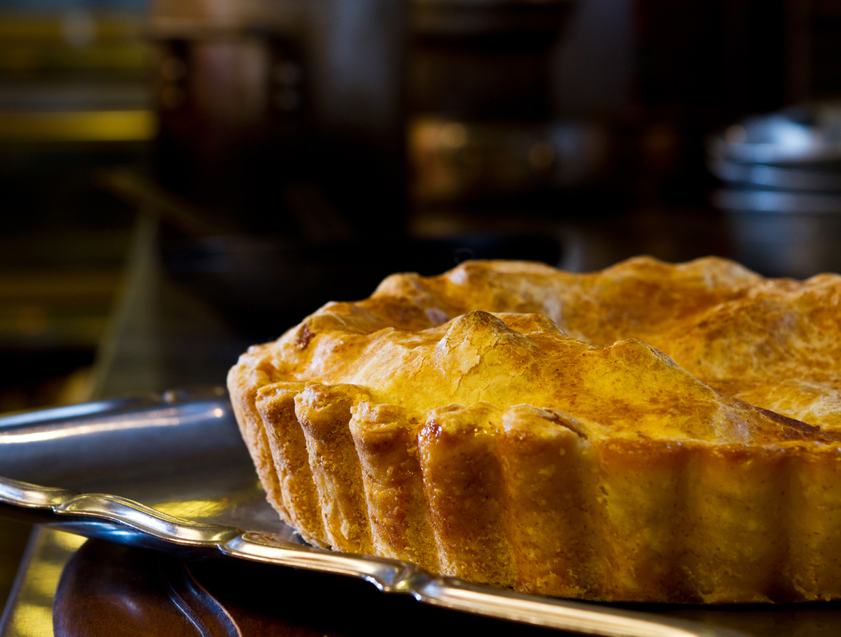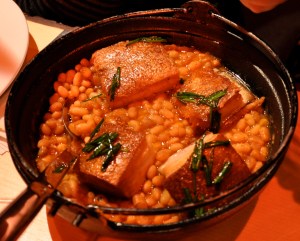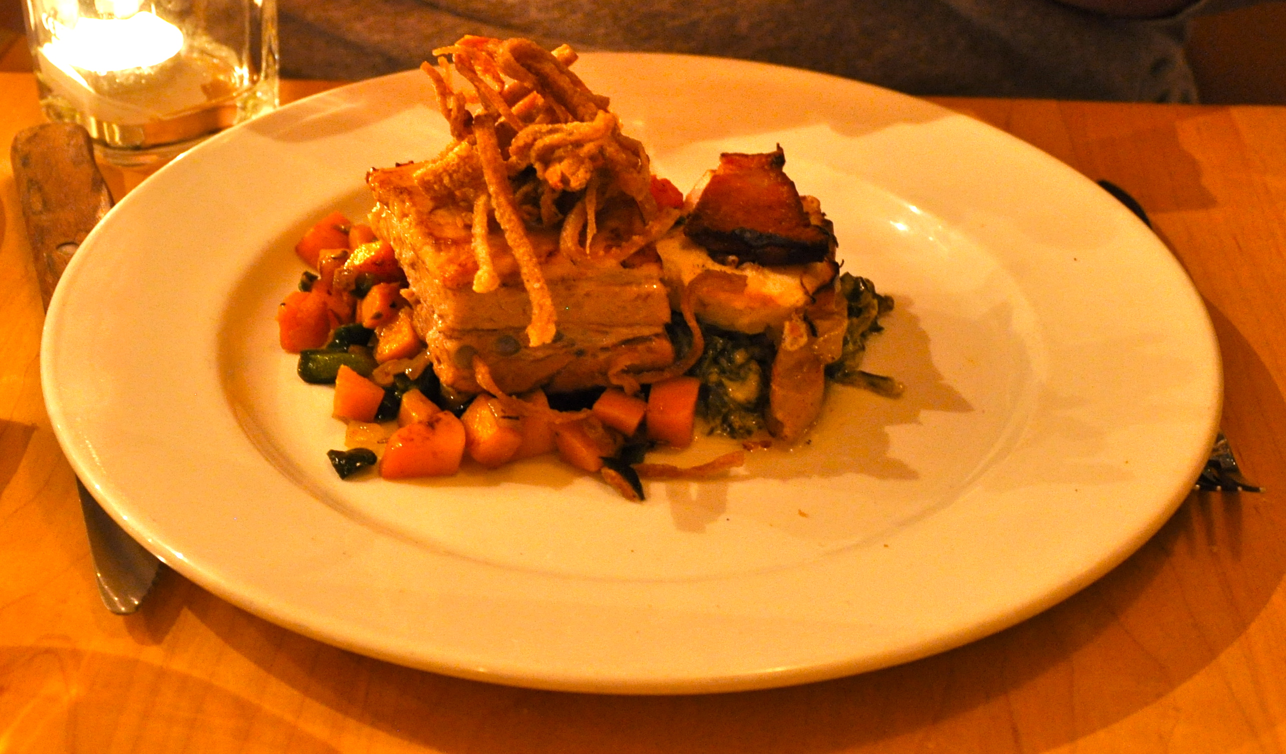 Tarte de boudin. (Image: courtoisie Bicom communications)Poitrine de porc croustillante et haricots blancs à la mélasse.À-côté de légumes racines braisés.