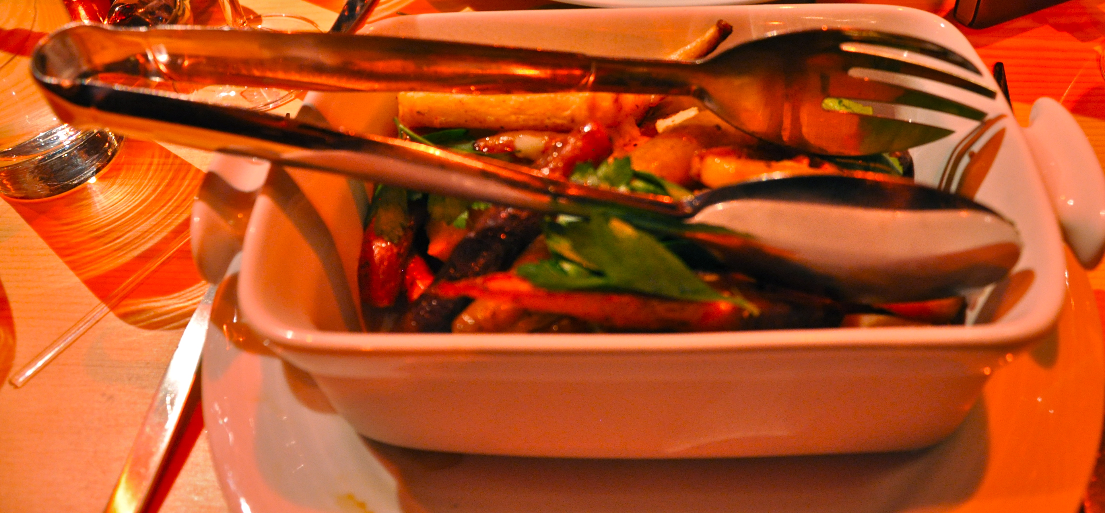 Par la suite, le saghanaki flambé à l’Ouzo; j’adore les fromages flambés et celui-ci était plutôt bien réussi. Le saghanaki se trouve à être un fromage panné frit et ensuite flambé, c’est légèrement croustillant à l’extérieur et tendre et fondant à l’intérieur (j’en mangerais en ce moment même, haha!) Nous avons également eu, lors de ce service, des betteraves jaunes, pommes granny smith, et pacanes rôties qui étaient délicieuses, ainsi qu’une salade de roquette du Québec, canard confit et canneberges séchées.