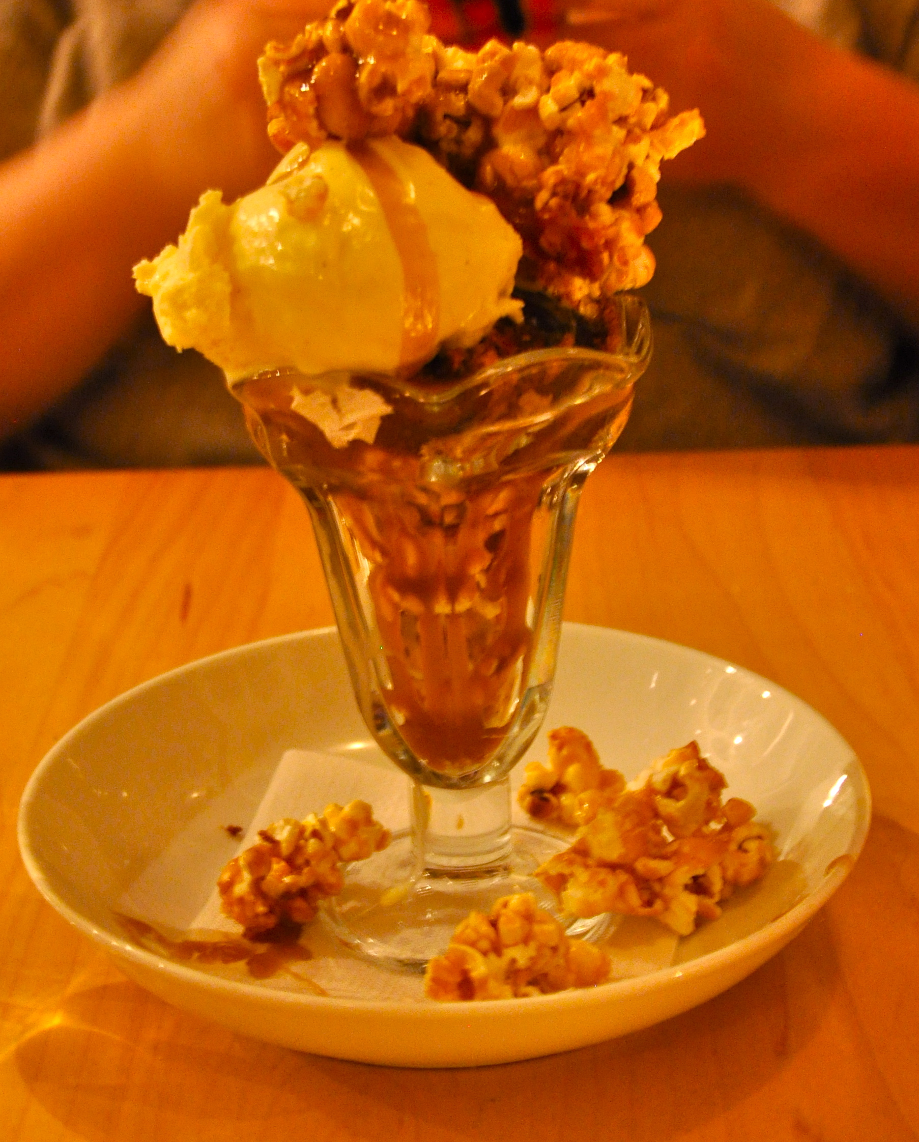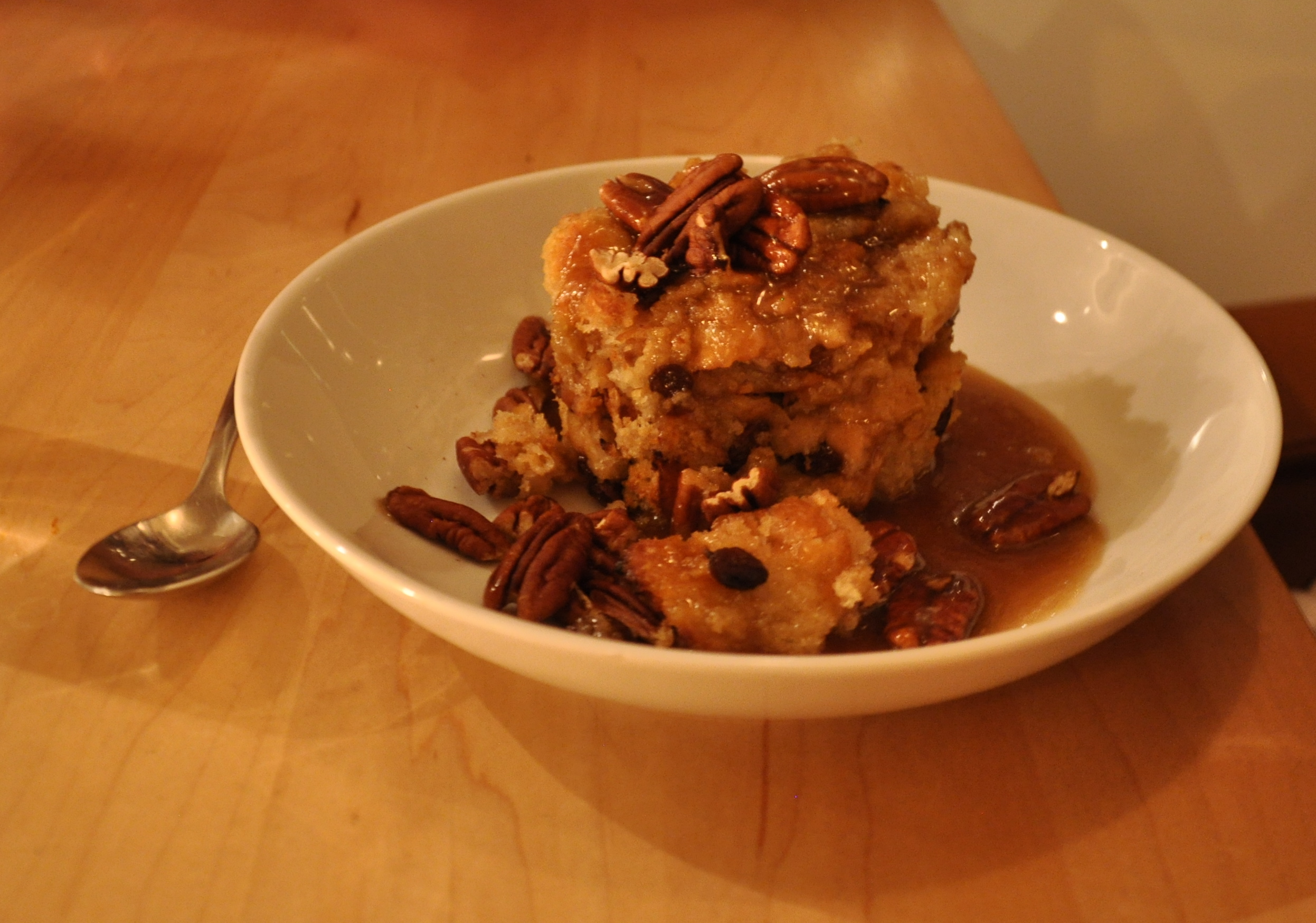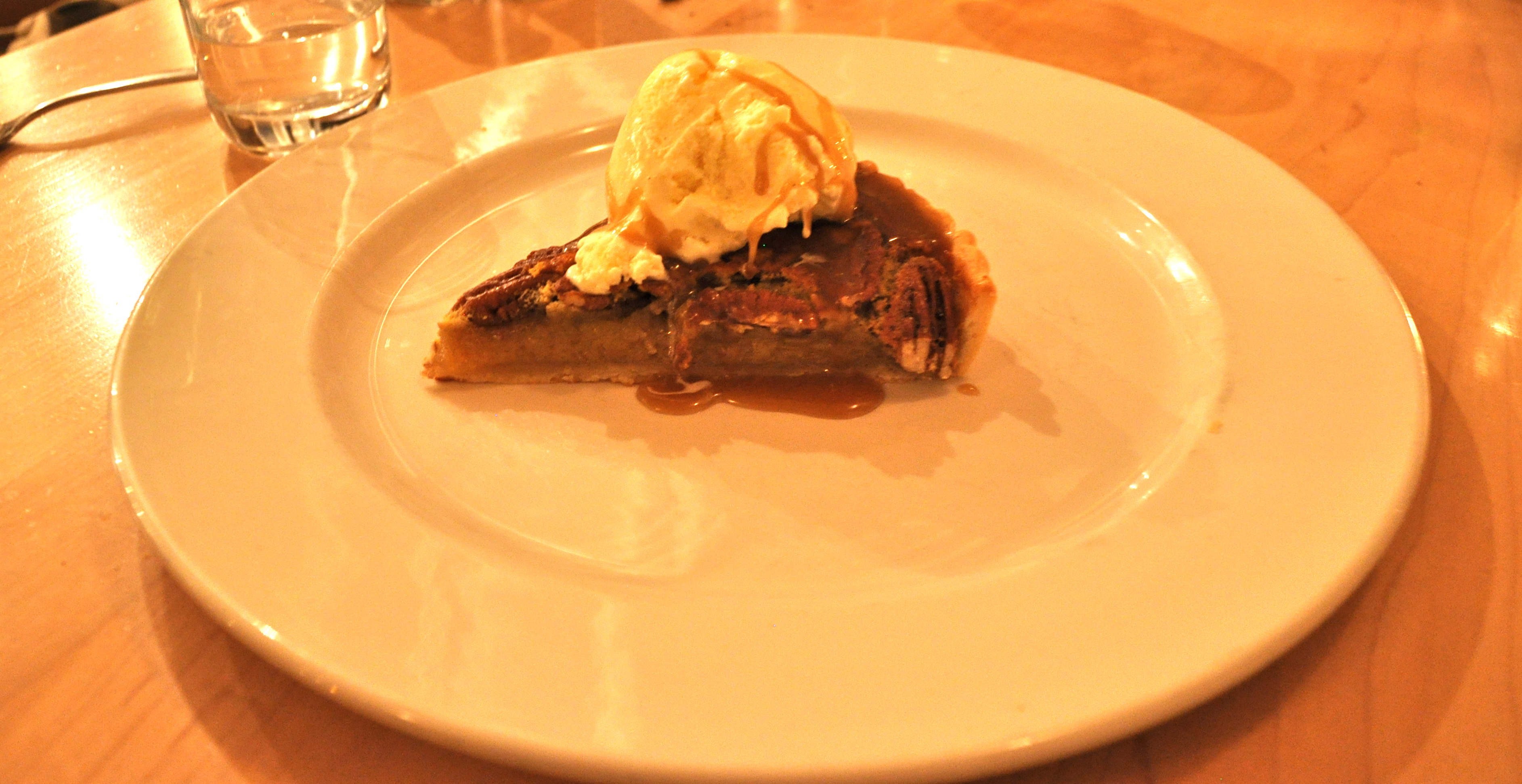 Comme dessert, j’ai choisi la tarte aux pacanes cuisinée par la belle mère du cuisinier. D’ailleurs, tous les desserts que vous trouverez au Kitchenette sont cuisinés par cette dame au talent certain pour les sucreries. La tarte était bonne, mais j’ai de loin préféré le dessert de mon amie Ève qui était le sundae au sticky toffe pudding et Crackers Jacks maison. C’était tellement décadent, j’en voulais encore. Je dois également donner une mention spéciale au poudding au pain qui était succulent!