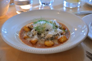 L’une des choses que j’aime de la cuisine de Nick Hodge est le fait qu’elle est tellement réconfortante. Tout comme son restaurant d’ailleurs, puisqu’arriver au Kitchnette, c’est un peu se sentir comme chez un ami. Serveur sympathique, ambiance agréable sans être trop bruyante, et nourriture alléchante. Le plat que Nick a présenté : des gnocchis de maïs avec du crabe Dungeness, servis dans une sauce bisque. Connaissant la cuisine de Nick à la base, je dois dire que je m’attendais à un plat très consistant. Ceci étant dit, ce plat était tout en douceur et les gnocchis fondaient sous la dent. Adorant le crabe, ce plat a su me charmer et, encore une fois, l’élément réconfortant présent dans les plats de M. Hodge venait y ajouter la petite touche finale.