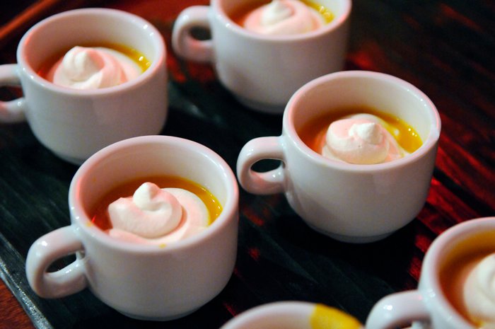 Potage de carottes au gingembre et cari, foam à la bière et érable