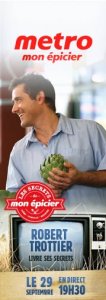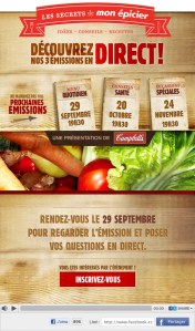 C’est une capsule vidéo de 15 à 20 minutes diffusée en direct sur la page Facebook de Metro qui permet au gens d’interagir et de poser des questions en direct au chef présent. Pour ce faire, vous devez cliquez sur J’aime dans le haut de la page et par la suite, vous diriger sous l’onglet ma webtélé lorsque le temps sera venu, l’émission sera alors diffusée. Nous pouvons affirmer que Metro est nettement un innovateur avec ce pilote. En effet, peu nombreuse sont les compagnies québécoises ayant utilisé un moyen comme celui-ci pour rejoindre ses fans.