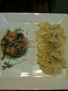 Mes deux autres amies ont pris, pour l’une, le tartare de saumon et, pour l’autre, les calmars frits dans une croûte au parmesan. Un gros, gros plus pour la mayonnaise maison à l’ail confit avec les calmars qui était SUBLIME! Je déteste la mayonnaise… vraiment beaucoup… mais celle-là… était beyond mayonnaise! Pour en finir avec les entrées, je dirais que j’ai gardé le meilleur pour la fin! Le tartare de saumon était, selon moi, l’entrée la plus réussie de toutes: tout simplement un plaisir pour la bouche.La sauce yogourt et caviar qui l’accompagnait nous a vraiment charmée.