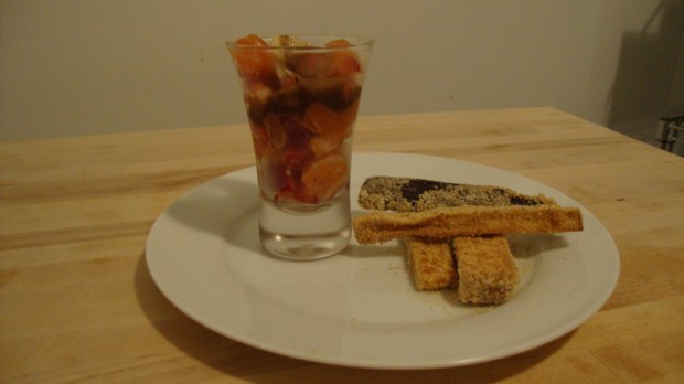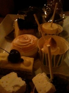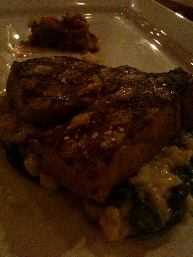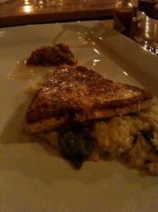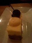 Pour les plats principaux, il y avait sur notre table de l’espadon, du thon et des pétoncles, le tout servi sur un risotto parmesan et crème et avec une petite salade (salsa concombre et tomate). Le risotto était un pur délice et les poissons étaient tous excellents. Une des caractéristiques que j’ai adorée de tous ces plats est l’assaisonnement qui était toujours parfait; ils étaient goûteux mais jamais trop prononcés. J’ai pu tester l’espadon que mon amie avait commandé – un baptême dans mon cas – et j’ai trouvé ce poisson succulent. Le reste des poissons (thon et pétoncle) étaient tout aussi bon. Un léger petit bémol de rien du tout: j’ai trouvé que mon thon était légèrement trop cuit. Mais le reste du repas était tellement parfait que ce fut vite oublié.